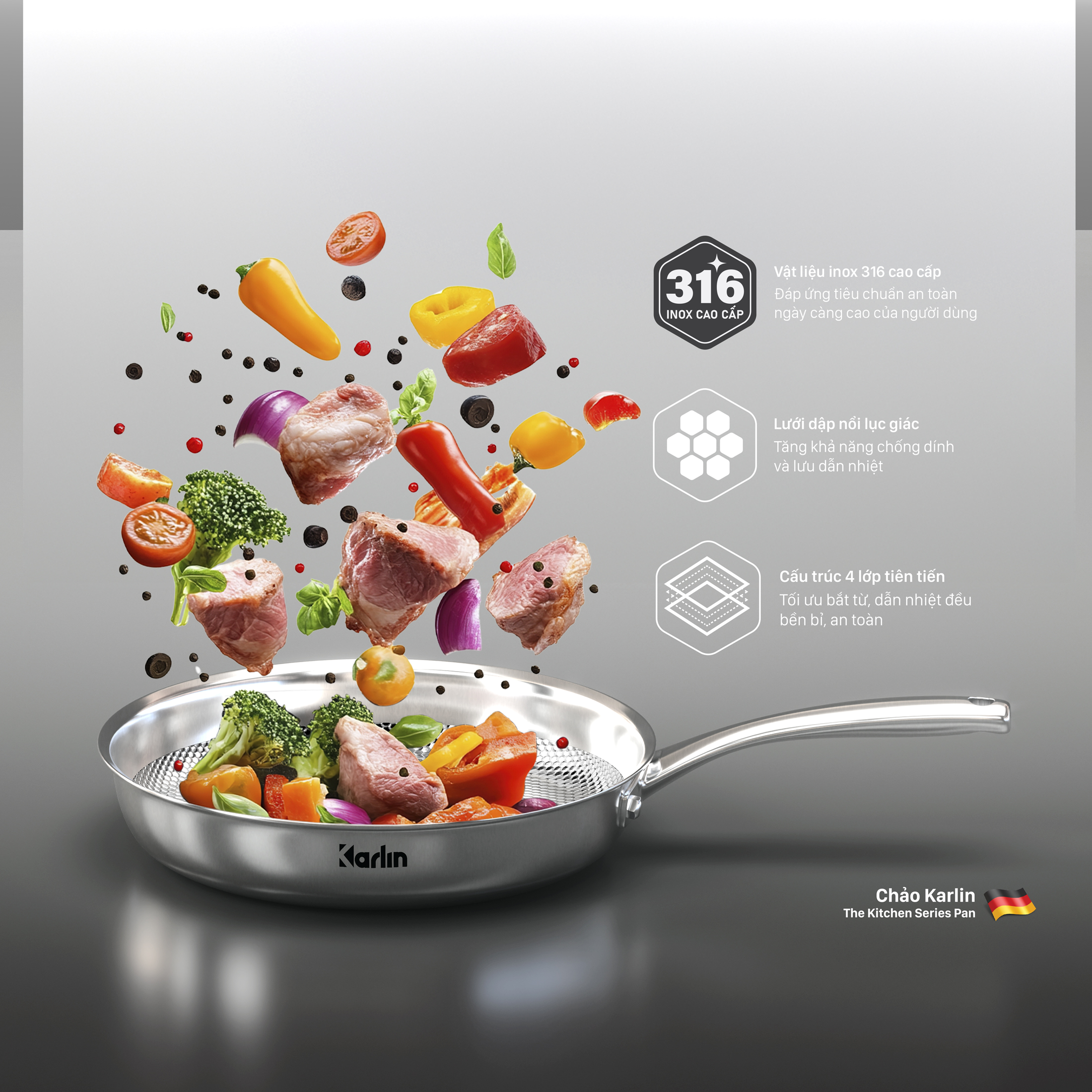 Chảo Karlin Chống Dính Tự Nhiên G26 PRO Inox 316 Đáy 4 Lớp 26cm x 6cm – Chuẩn Châu Âu
