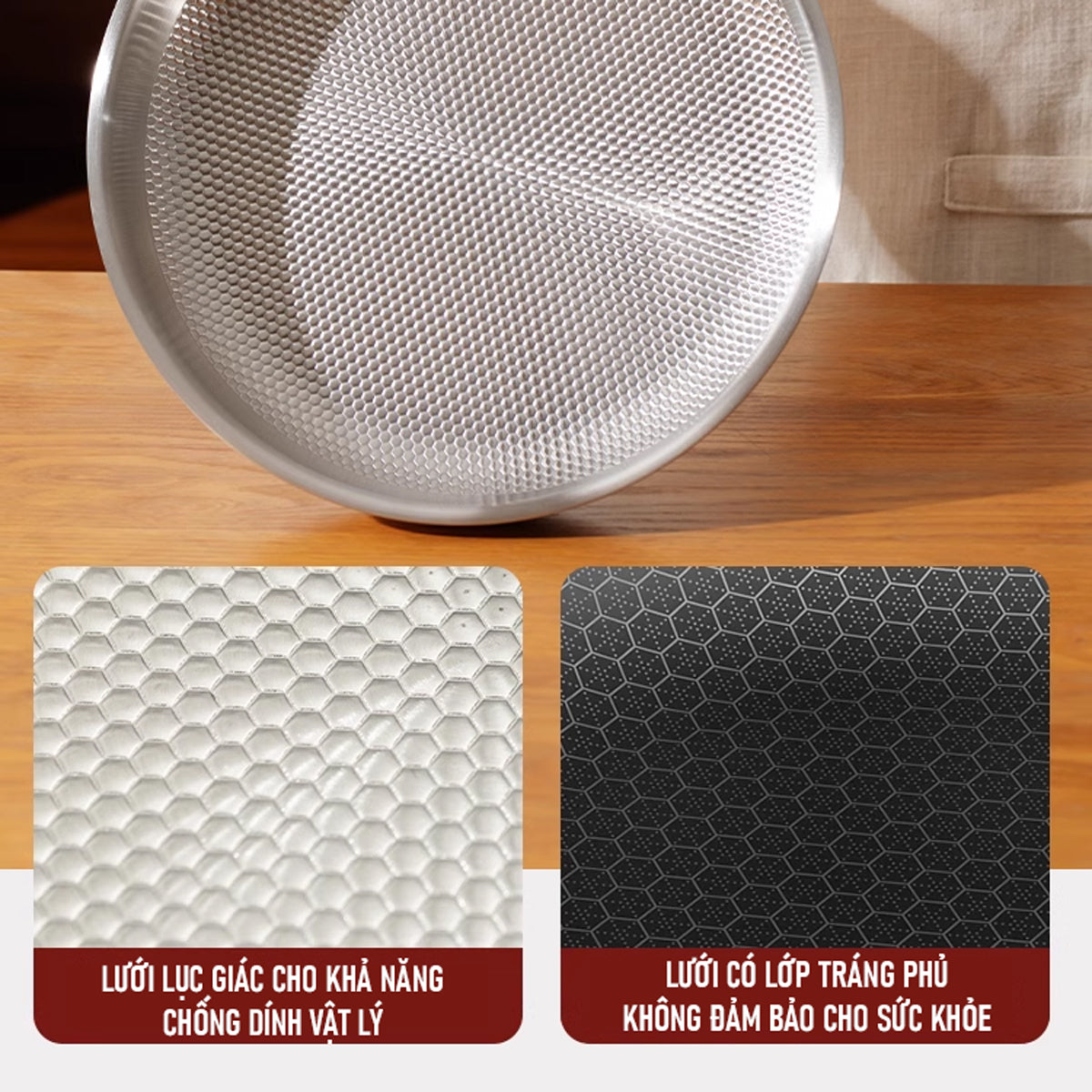 Chống dính tự nhiên với lòng chảo lưới tổ ong: Phiên bản mới với thiết kế lưới tổ ong tăng khả năng chống dính tự nhiên, giảm thiểu sử dụng dầu mỡ, đảm bảo món ăn lành mạnh hơn.